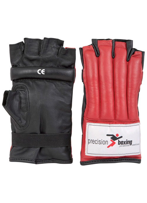 Made of leather filled with cotton. Elastic straps to wrists. CE marked. Packed in nylon and PVC bag.